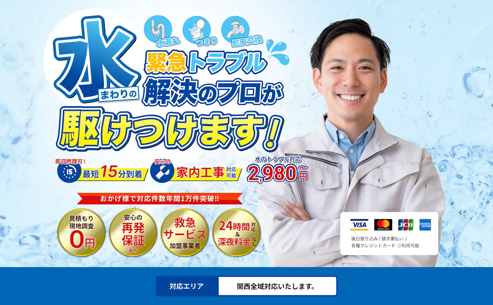 水回りのトラブルはスピードが命です。 私たちは 大阪・兵庫の業者として 地域に密着し、平均到着時間30分、簡単なトラブルはお電話から45分以内で解決します。24時間年中無休なので、どんな緊急トラブルもご連絡ください。